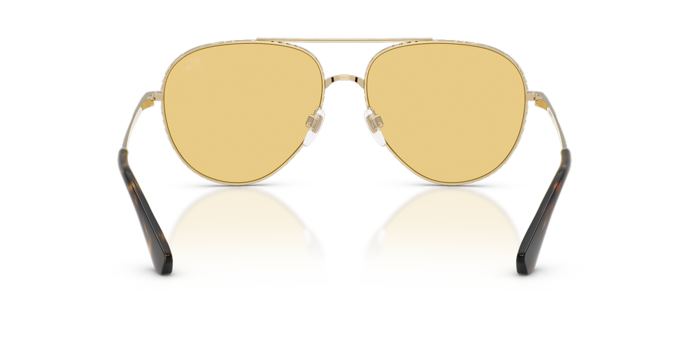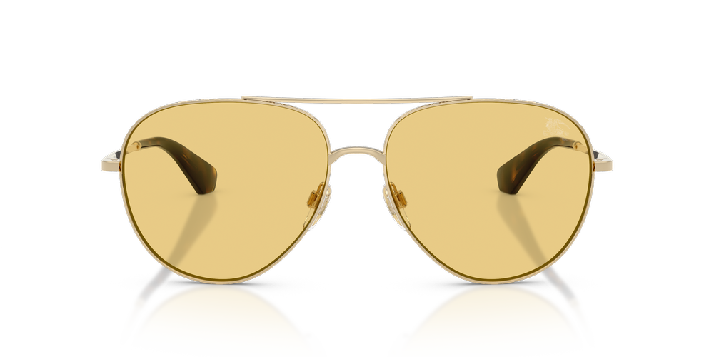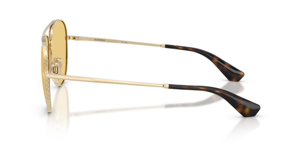 Elevate your look with the timeless elegance of the Burberry BE3172 sunglasses. The classic pilot frames feature a distinctive teardrop shape and a double bridge, crafted from lightweight gold-toned metal for a refined touch. Etched with Burberry’s signature check detailing, the rims exude sophistication, while faceted temples adorned with logo lettering add bold appeal. Finished with yellow lenses and adjustable nose pads for superior comfort, these Burberry sunglasses are a fusion of iconic style and modern wearability.
