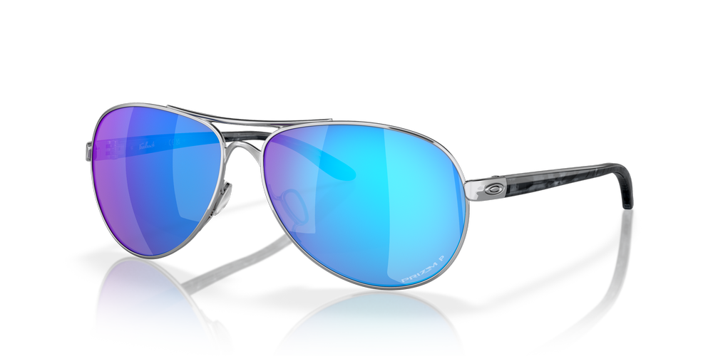 Embrace the sharp look of Oakley Feedback sunglasses. The polished chrome pilot frame with C 5 technology creates a unique style that sets you apart from the crowd. With polarized lenses in prizm sapphire lens treatment, you’ll experience unprecedented color and contrast enhancement that allows you to see more detail than ever before. Elevate your style with these pilot frames crafted from C 5 material for comfort and durability, all enhanced by the glare-defying benefits of prizm sapphire polarized lenses. Available with lens contrast enhancement technology.