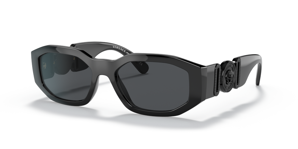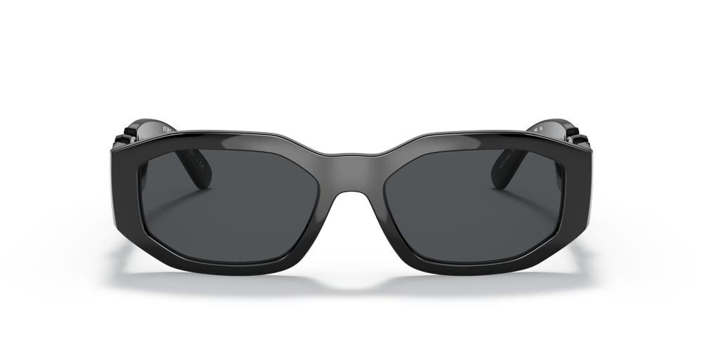 Discover Versace Biggie sunglasses, a tribute to the iconic hip-hop artist. The solid dark grey lenses and irregular frame shape exude urban cool style. Crafted in black color with a saddle bridge for comfort, these shades embrace timeless luxury paired with contemporary flair. Elevated by the signature Medusa adornment on the temple, these unisex sunglasses embody modern elegance and artistic expression that transcends generations.