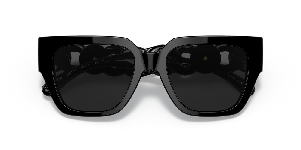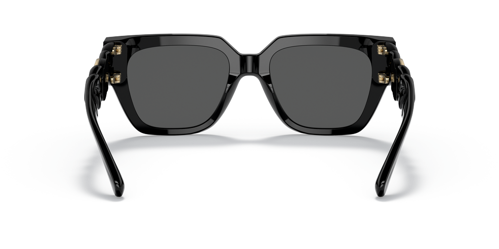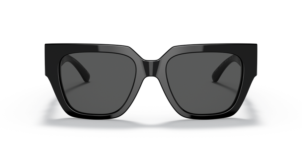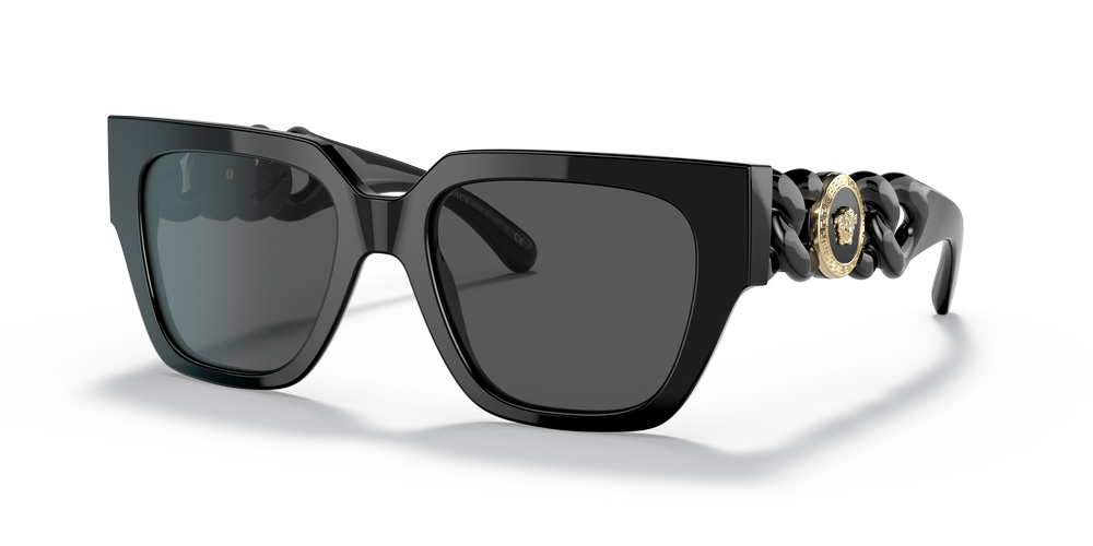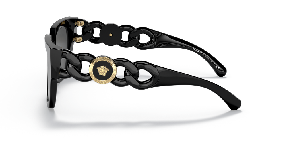 Experience the timeless elegance of Versace sunglasses. The square frame shape and solid dark grey lenses exude sophistication, while the iconic emblem decorates the temples in shiny black color. Crafted from premium acetate material, these shades offer comfort and style. The iconic Medusa decor on the temple is polished black, while the material ensures both comfort and style. Embrace a fusion of past and present with these exquisite square-framed sunglasses, where each detail is a testament to the enduring legacy of Versace’s design.